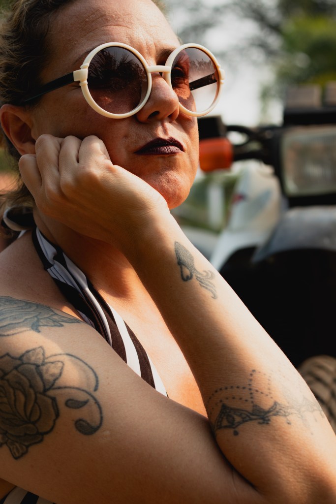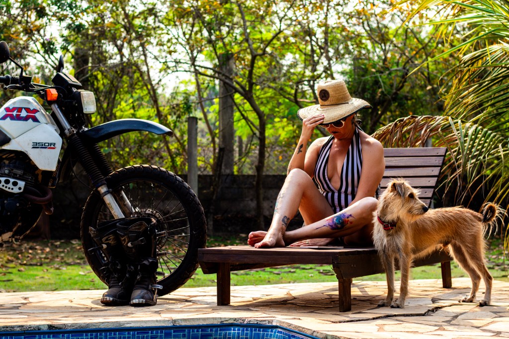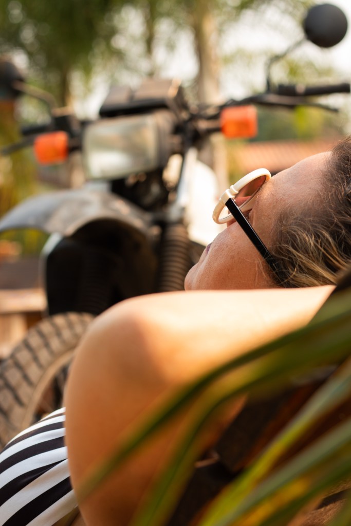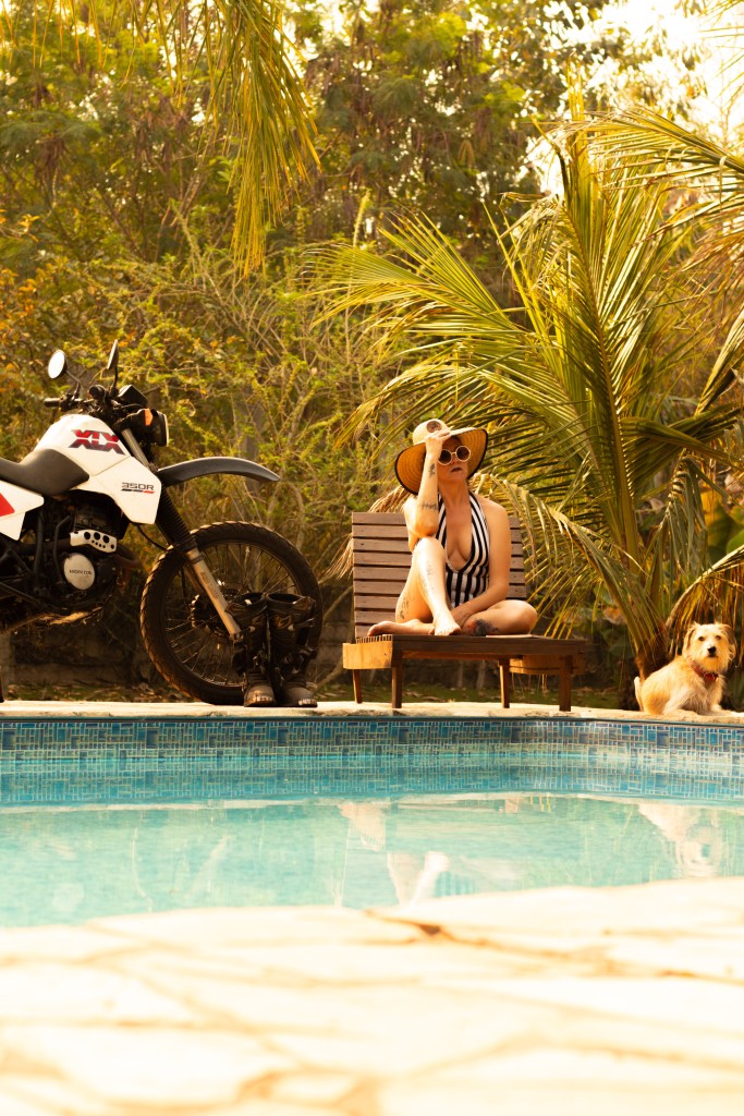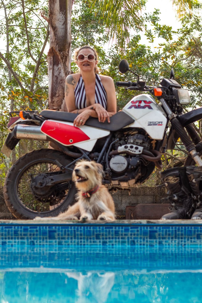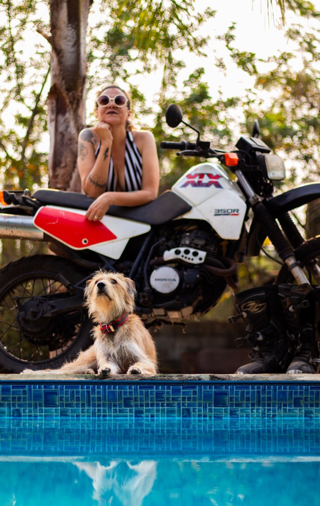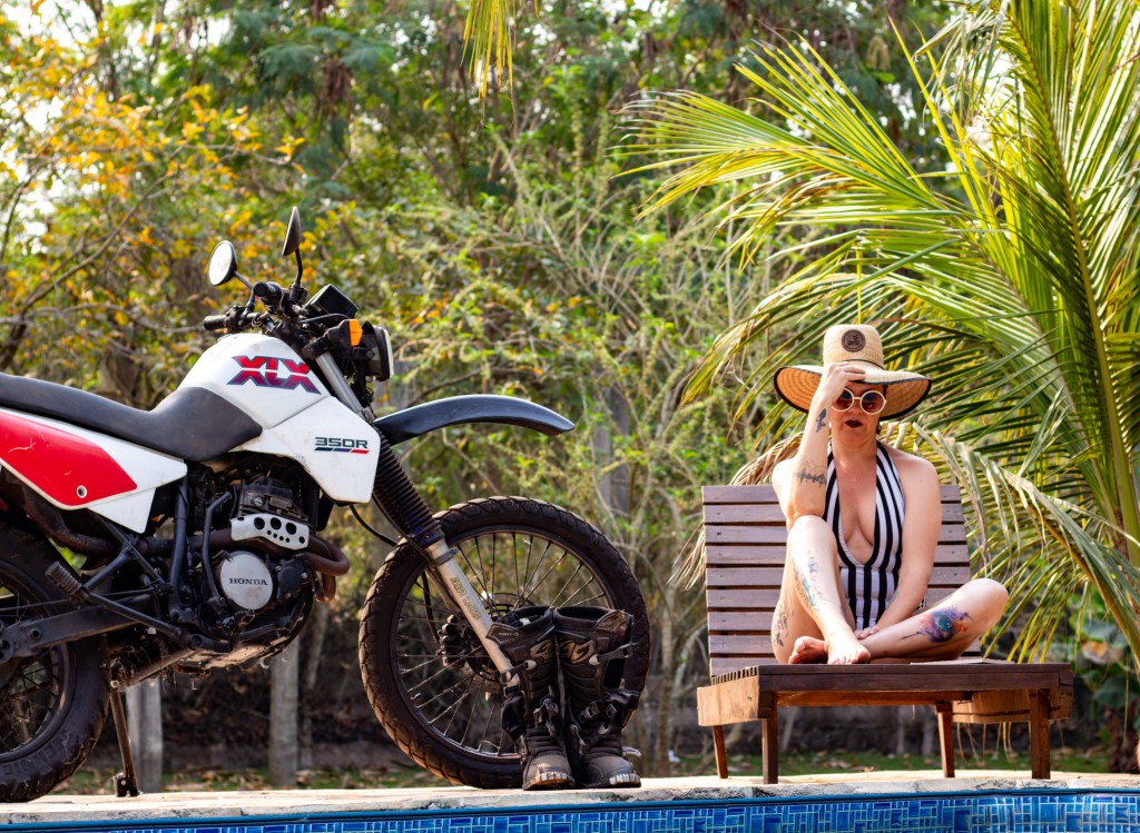 O clássico e o charme da estrada se destacaram em meio à paisagem rural de Campinas, interior de São Paulo. À beira da piscina de um sítio rústico, Cris mostrou sua essência, evocando o estilo retrô que combina perfeitamente com sua XLX 350 branca, ano 1990. Cada clique revela um equilíbrio entre força e leveza, expressando a liberdade e autenticidade que definem tanto a moto quanto sua dona.